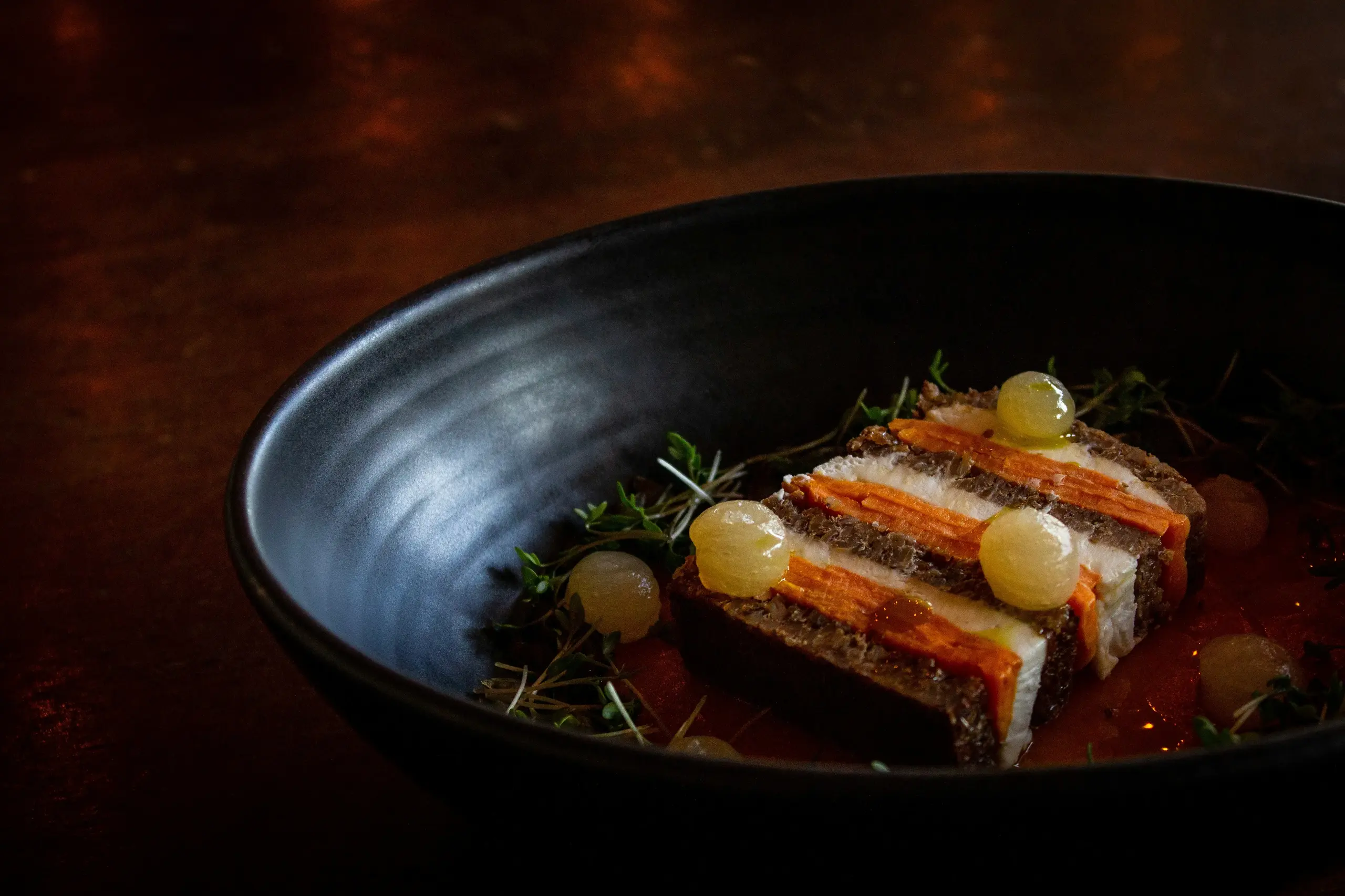 Grilled beef tenderloin steak cooked to perfection, served with a Barolo wine reduction sauce, roasted potatoes, and seasonal vegetables.